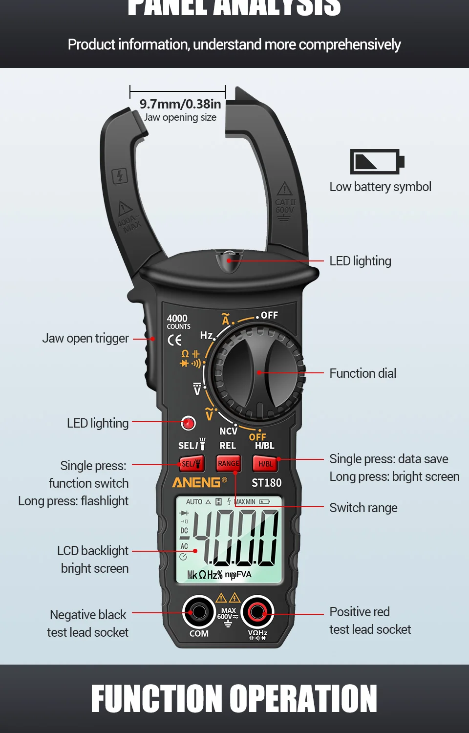 ANENG ST180 Multímetro de Pinza Digital 4000 Cuentas