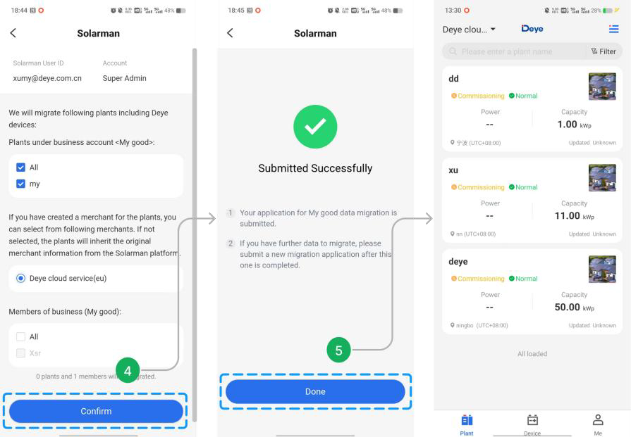 - Si hay una cuenta de negocio en Deye Cloud, se puede seleccionar la planta para migrar a ella y la organización de negocio no se migrará; Si no se selecciona, se creará una nueva cuenta de negocio con la información de negocio de Solarman y se puede seleccionar la migración de miembros de negocio.