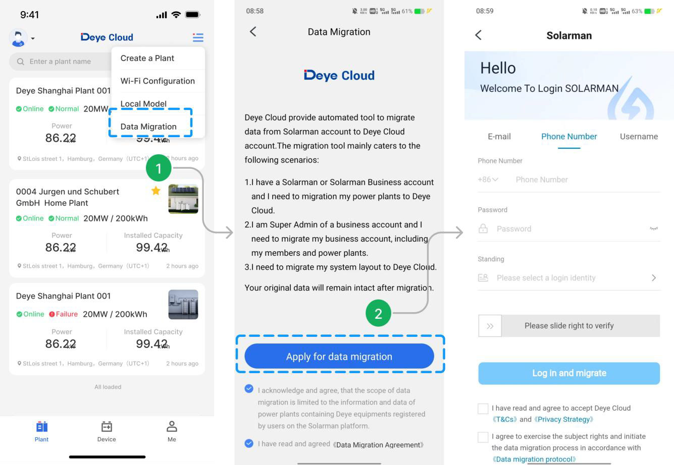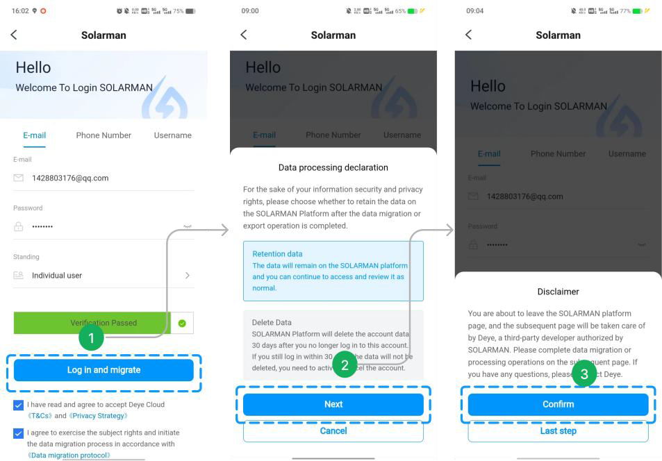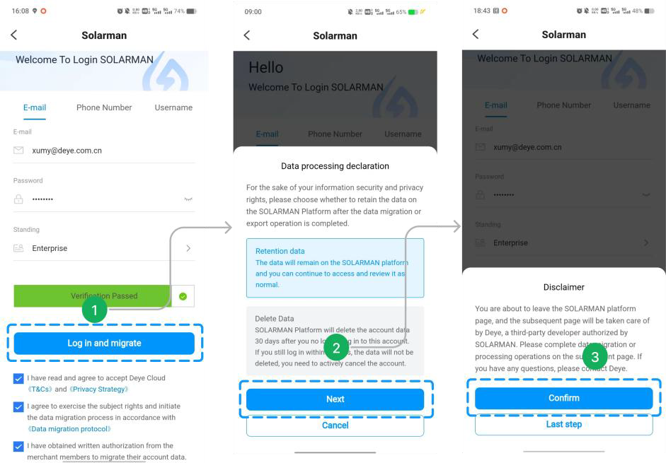 - ✅ Paso 2: Marque los términos a continuación y toque en 【Solicitar migración de datos】 para acceder a la página de inicio de sesión de Solarman.