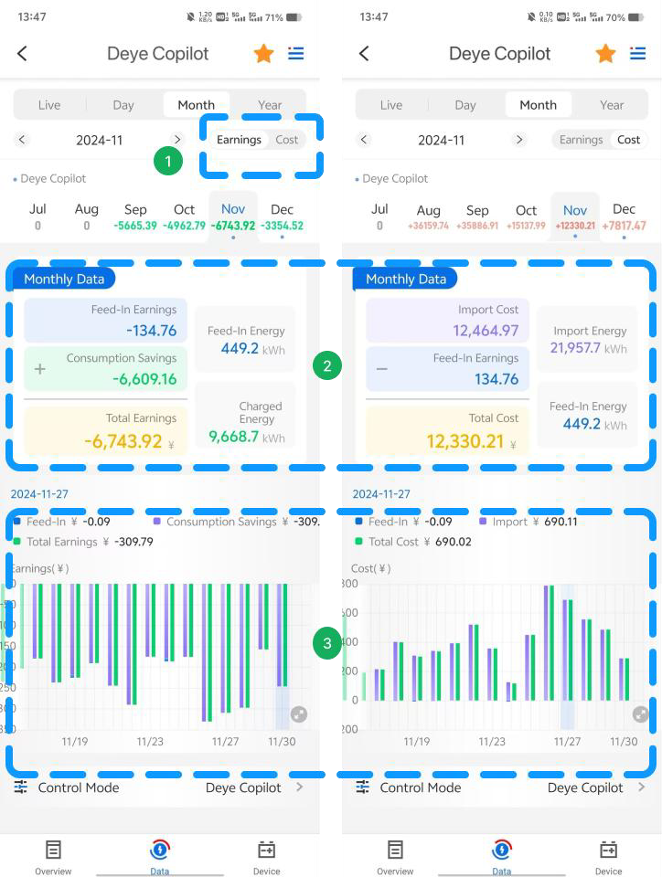 - 📅 Toque cualquier día del mes en el gráfico de barras para ver sus datos diarios.