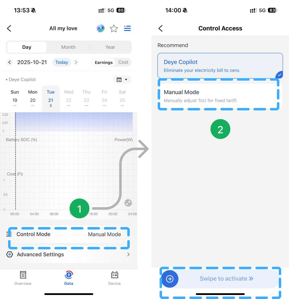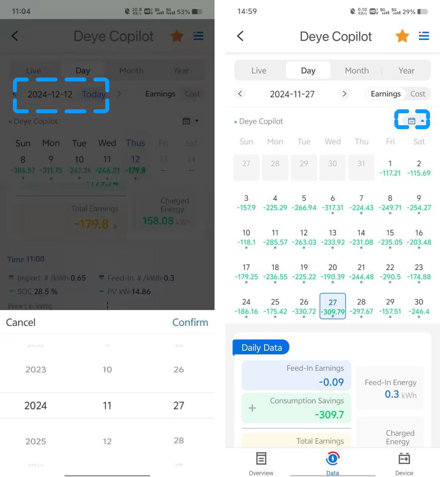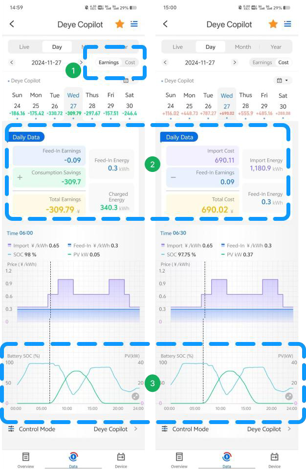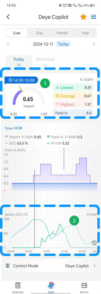 - 📈 Las curvas de potencia de generación PV y SOC de la batería de la fecha seleccionada. Al mismo tiempo, también se pueden combinar con la curva de precio de la electricidad junto con la vista de los datos del período de tiempo del día, ¡muy intuitivo y conveniente!