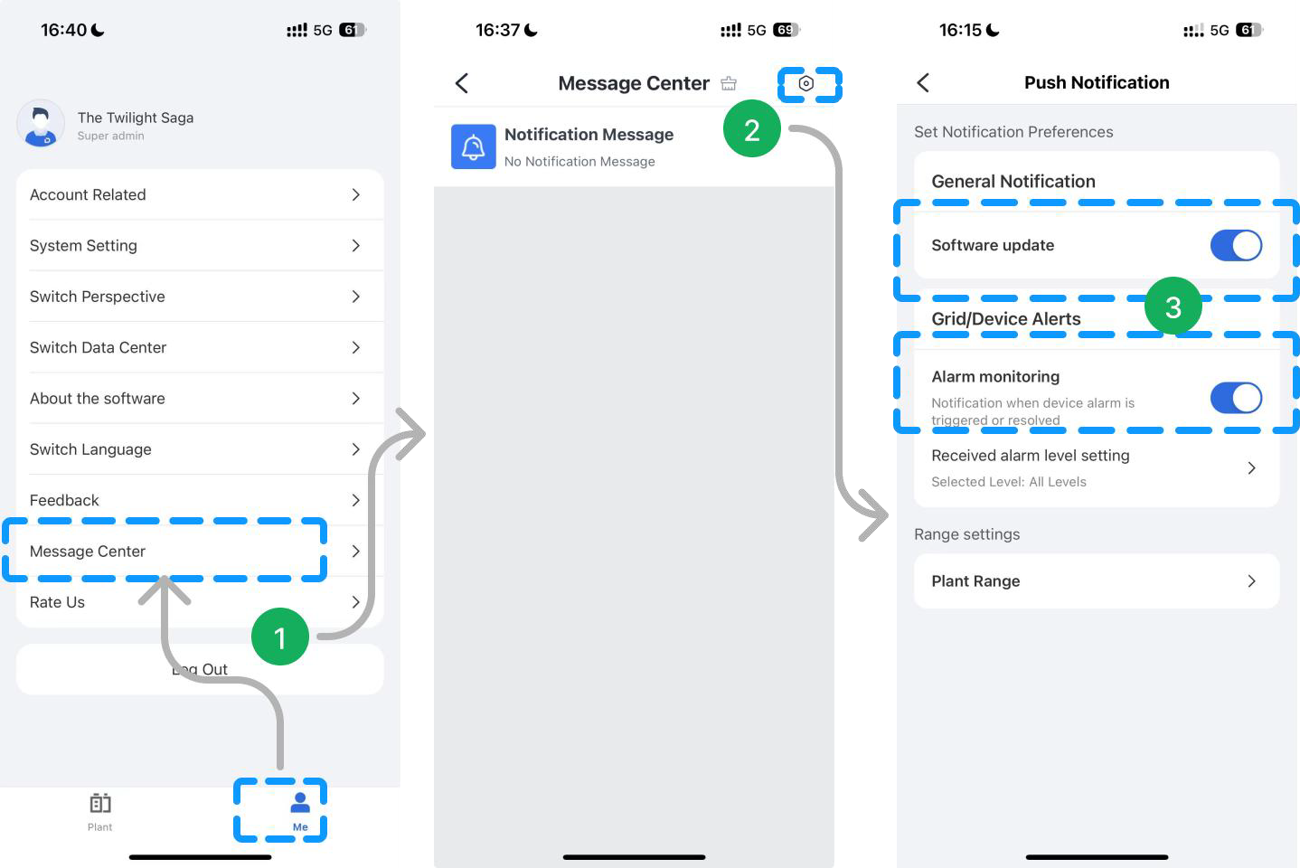 El Centro de Mensajes está abierto para perspectivas Personales y de Negocio. Los usuarios pueden establecer preferencias de notificación (incluyendo actualización de software de la aplicación y monitoreo de alarmas, etc.) y la función «Rango de Planta» está diseñada especialmente para la perspectiva de Negocio.