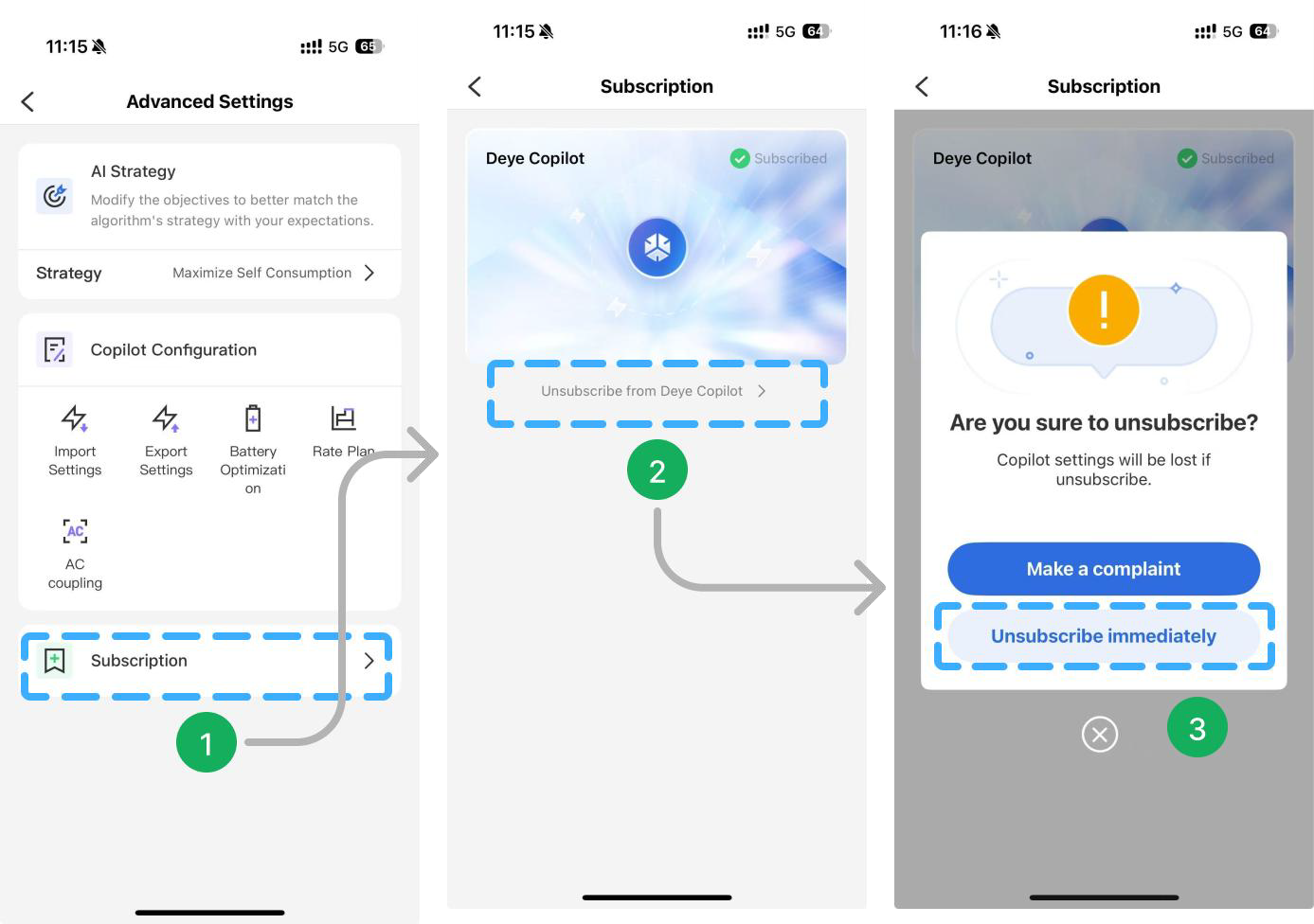 - ❌ Paso 2: Toque «Cancelar suscripción» para cancelar la suscripción a Deye Copilot.