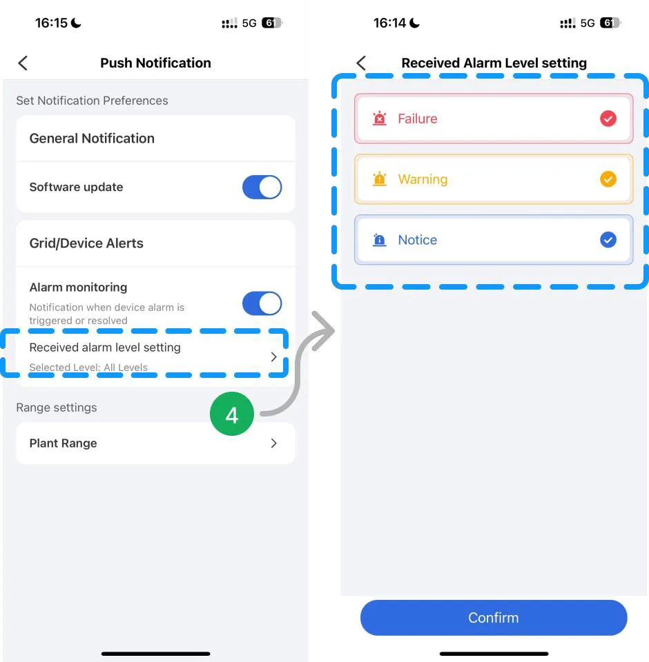 - ⚠️ Paso 4: «Configuración de nivel de alarma recibida» se puede usar para configurar el nivel de alarma.