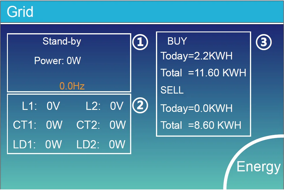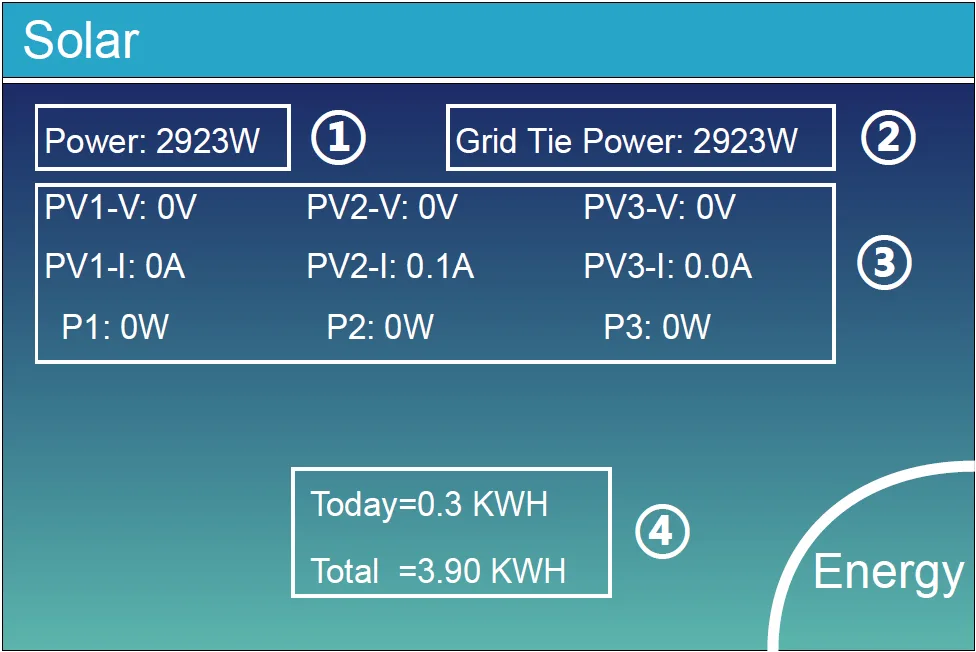 - Potencia Inyectada a la Red (Grid Tie Power): cuando hay un inversor de cadena (string inverter) acoplado en CA al lado de la red o de la carga del inversor híbrido, y hay un medidor instalado para el inversor de cadena, entonces la pantalla LCD del inversor híbrido mostrará la potencia de salida del inversor de cadena en su icono de PV (fotovoltaico). Por favor, asegúrese de que el medidor pueda comunicarse con el inversor híbrido correctamente.