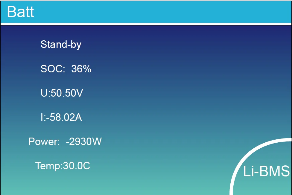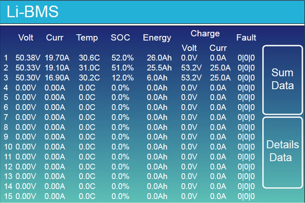 | 1 | 50.38V | 19.70A | 30.6°C | 52.0% | 26.0Ah | 0.0V | 0.0A | 0|0|0 |